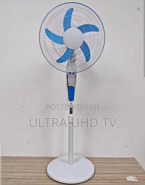 White and blue 16-inch rechargeable pedestal stand fan, potentially solar-powered.