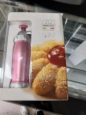 This is a Marcato biscuits machine, also known as a cookie cutter, made of stainless steel in Italy. The product is silver in colour and comes new and boxed