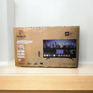 The image shows a "Popular Electronics" 55" 4K Smart TV. Key specifications and features include: