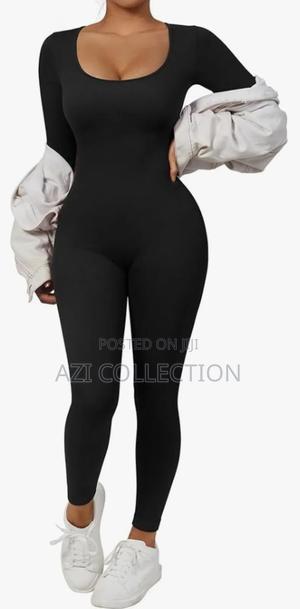The outfit shown in the image is a black, long-sleeved, full-length bodysuit or jumpsuit, often marketed as activewear or casual wear.