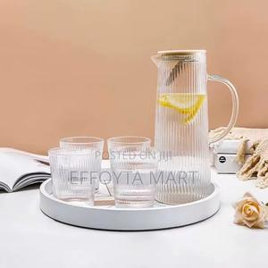 ከወፍራም ብርጭቆ የተሰራ የውና/ የጁስ ማቅረቢያ ጆጉ ማጣሪያ ወንፊት ያለው ትኩስና ቀዝቃዛ መጠጥ ማቅረቢያና መጠጫ አንድ ጆግና 4 መጠጫ ብርጭቆዎች ከ-20°c ቅዝቃዜ እስከ 120°c ሙቀት የሚቋቋም ጆጉ 1.3 ሊትር ውሃ ሲይዝ መጠጫዎቹ ደግሞ 200ml ውሃ ይይዛሉ