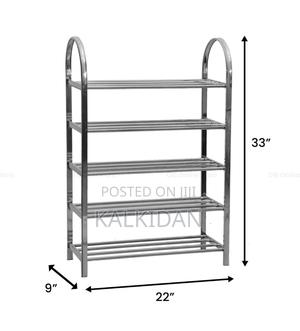 የጫማ መድርደሪያ ከማይዝግ ብረት የተሰራ እና ባለ 5 ደረጃ የቦታ አጠቃቀምን የሚያቀላጥፍ እና ለአጠቃቀም ምቹ የሚገጣጠም Size 48cm የውስጥ ስፋት : 74cm ቁመት:18.5cm የጎን ስፋት ያለው
