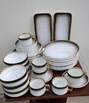 100% ኳሊቲ ሴራሚክ ወፍራም ልቅም ተደርጎ የተሰራ 6 የወተት/የሻይ መጠጫ ማጎች ከማስቀመጫው ጋር 6 የኬክ ሸክላ ሳህኖች 6 የሾርባ ጎድጓዳ ሳህኖች 6 የመመገቢያ ዝርግ የሸክላ ሳህኖች 2 ረዘም ያሉ ሰርቪሶች