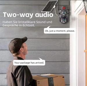 Smart outdoor CCTV camera with solar panel and built-in battery. Supports both 4G SIM and WiFi for flexible connectivity. Features ultra-clear 4K dual lenses, motion detection, night vision, and remote viewing via V380 app. Ideal for homes, farms, shops, or remote areas.