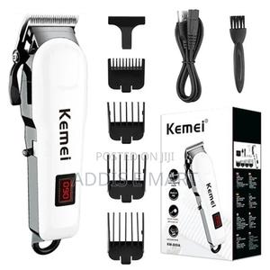 Kemei Hair clippers have Digital battery percentage indicator Can use in AC + DC mode Super sharp cutting blade Professional quality 4 sizing comb clips White color Lightweight Easy to carry & cut hair