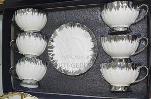Turkish coffee cup and saucer set featuring a distinctive white and silver metallic drip design.