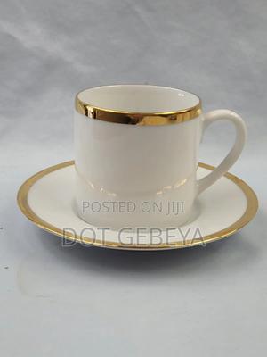 Vintage white ceramic demitasse cup and saucer set featuring luxurious gold trim along the rims.
