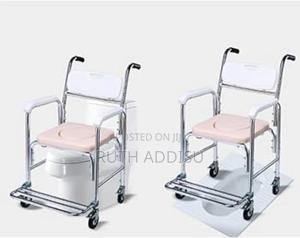Folding commode shower wheelchair. This type of medical device is designed for individuals with limited mobility, combining the functions of a commode, a shower chair, and a transport wheelchair.