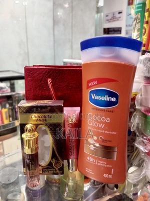 Gift package:Vaseline lotion, lip gloss and chocolate musk with gift bag. Free delivery