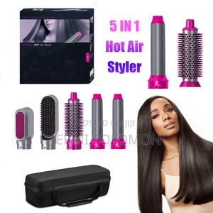 The 5-in-1 hot air styler combines multiple styling tools into a single device, offering versatility and flexibility. It includes a brush attachment, 2 air curling wands, straightening brush, and dryer nozzle.