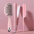 This is a 3-piece pink hair styling set, including a curved, vented paddle brush, a ceramic flat...