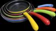 Five Nonstick Frying Pans Colorful Handles and colorful sides