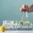 A five-piece glass storage container set, each featuring a light green lid, is ideal for storing...