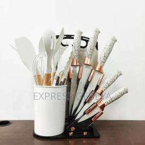 20 Set Silicone Knife and other Utensils 20 ሴት የስልከን ጭልፋ እና ቢላዋ ከፍተኛ ሙቀት ከሚቋቋም ከሲልከን የተሰሩ የማይጫጫሩ የማይመነችኩ እና ኪችንዎን ሙሉ የሚያደርጉ 11 ማማሰያና ጭልፋዎች 5 በሴራሚክ የተለበጡ ቢላዎች 1ካሮት, ድንች መላጫ 1 መቀስ 1 የማይጫጫር ጠንካራ መክተፊያ ከማስቀመጫቸው ጋር 20ፕች ዋጋ 4,300ብር