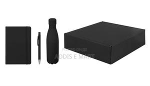 Gift set containing vacuum water bottle, pen and notebook - with matching color and premium soft touch feel.